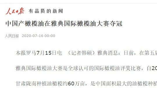 2020年在希臘國際橄欖油大賽中,隴南祥宇橄欖油又從來自全球430份橄欖油樣品中一舉奪魁,