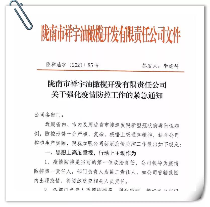 確保今年油橄欖鮮果收購(gòu)工作圓滿完成,隴南市祥宇油橄欖開發(fā)有限責(zé)任公司根據(jù)實(shí)際情況及時(shí)成立了疫情防控小組,